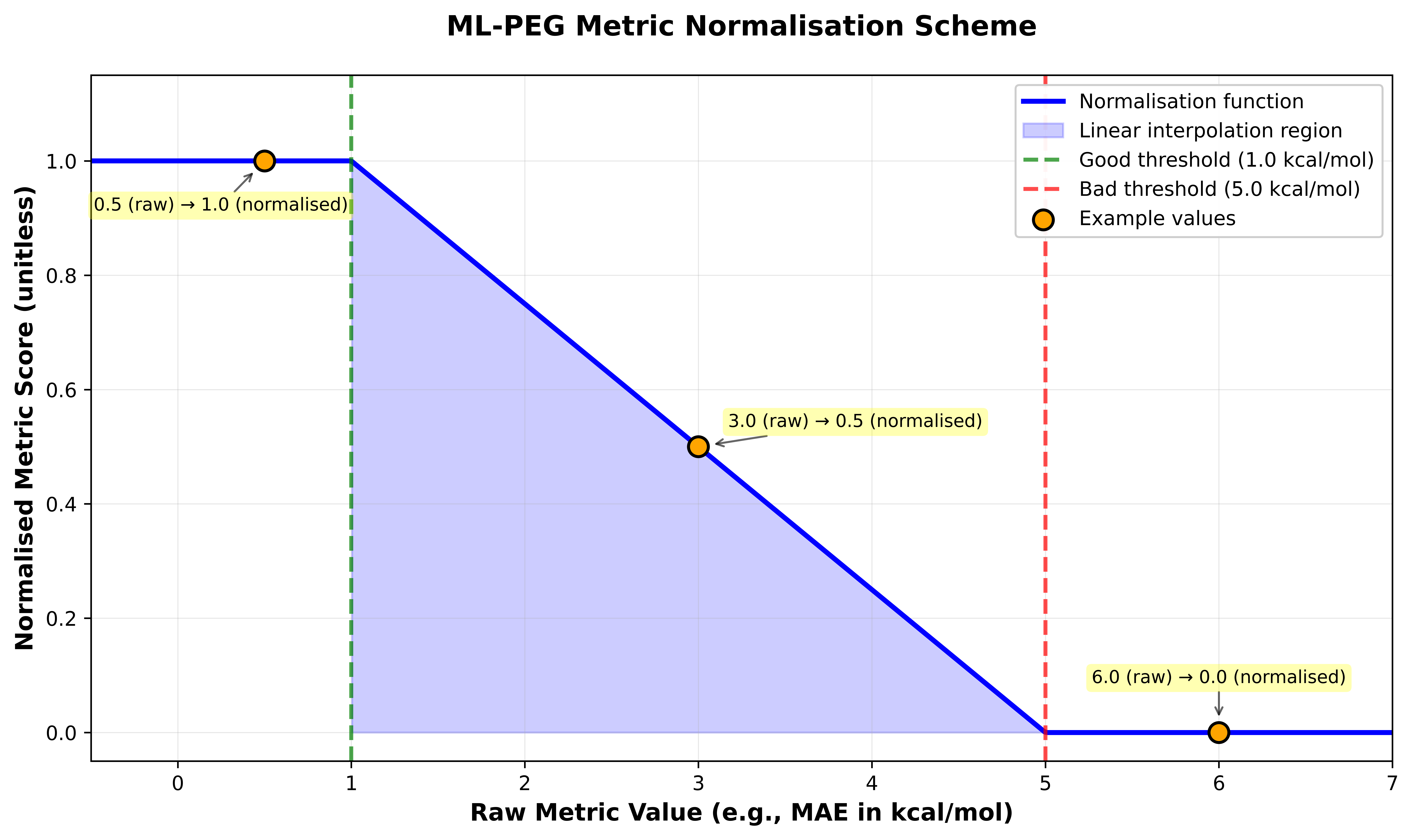 The figure above illustrates the default normalisation scheme used. Here, the normalisation is linear between these thresholds, with scores capped at 0 and 1 outside the thresholds. For example, if a metric has a “good” threshold of 1.0 kcal/mol and a “bad” threshold of 5.0 kcal/mol, a raw metric value of 1.0 kcal/mol or lower will yield a score of 1.0, a raw value of 5.0 kcal/mol or higher will yield a score of 0.0, and a raw value of 3.0 kcal/mol will yield a score of 0.5.